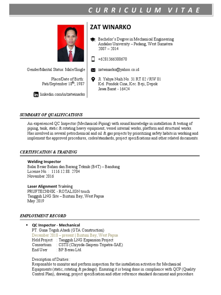 Keywords Quality assurance CV template relevant work experience quality management compliance activities training needs recommendations QA skills. Contoh resume Quality Control QC Inspector CV ini contoh resume kerja yang diperuntukkan quality control inspector atau QC. Contoh Surat Lamaran Qc Maka dari itu surat lamaran dan cv sangat dianjurkan dibuat semenarik mungkin baik dari segi isi surat maupun kemasannya.