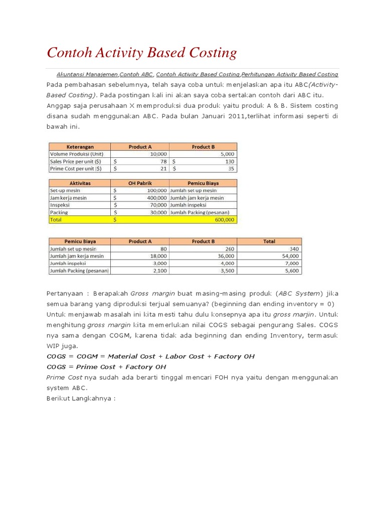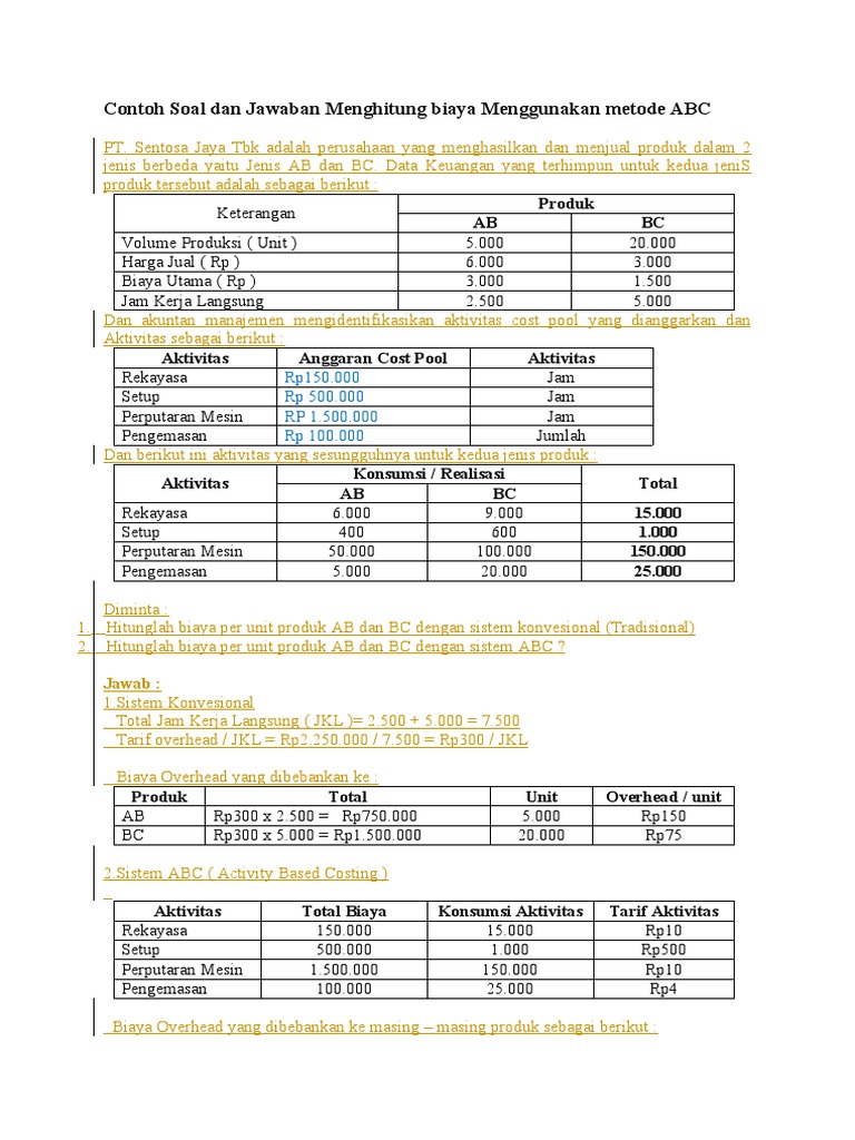 View Homework Help – Contoh Soal dan Jawaban Menghitung biaya Menggunakan metode ABC from ECONOMY 190 at Jenderal Soedirman University. Pengertian Activity Based Costing Menurut Para Ahli Menurut Mulyadi 2003. Sentosa Jaya Tbk adalah perusahaan yang menghasilkan dan menjual.