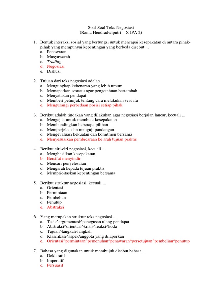1 10 Soal Teks Negosiasi Pilihan Ganda dan Jawaban. Latihan soal PTS genap kelas 10 SMA MA ini untuk membantu belajar peserta didik dalam memahami materi bahasa Indonesia. Karena pada kurikulum sebelumnya materi pelajaran ini masih belum diajarkan untuk tingkat SMA.