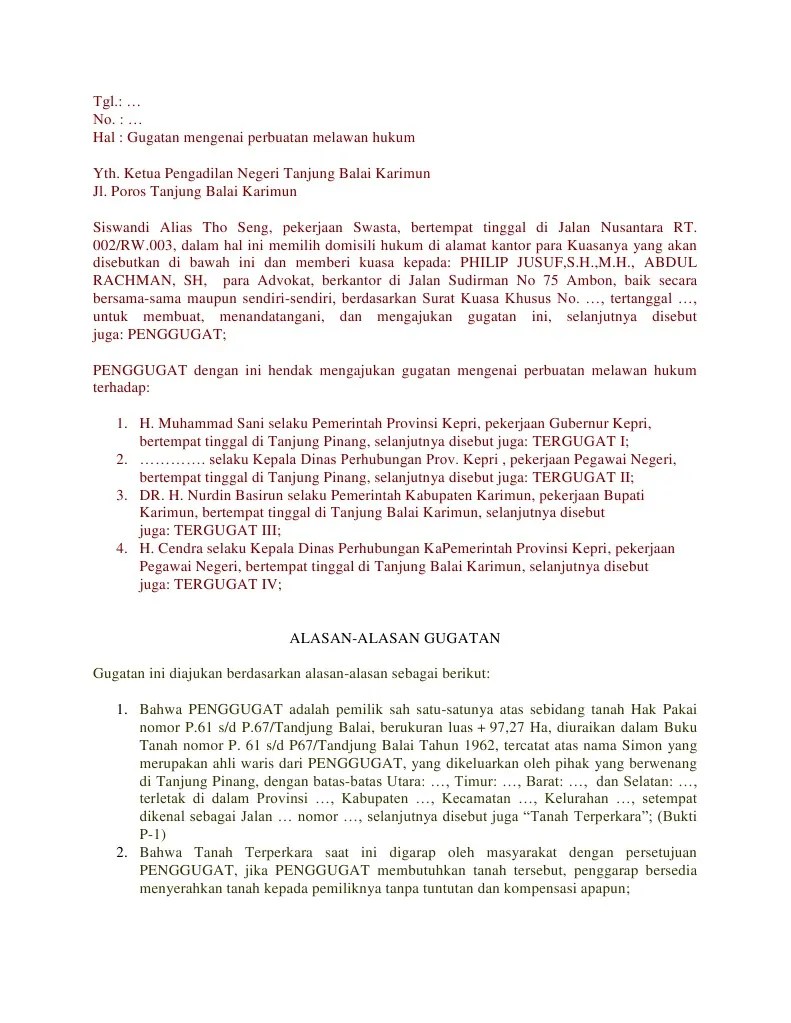 Contoh Surat Gugatan Perbuatan Melawan Hukum – Contoh surat gugatan perbuatan melawan hukum yang baik dan benar sebagai referensi pembuatan surat resmi yang dapat diunduh secara gratis dan lengkap. Mohon maaf apabila terdapat kesamaan nama tempat ataupun informasi di dalamnya karena semua surat hanya bersifat percontohan saja tanpa ada maksud apapun. Di pengadilan negeri muara bungo. Ketua pengadilan negeri purwodadi. Bapak ketua pengadilan negeri klaten di jl. Demikian contoh surat gugatan perbuatan melawan hukum ini semoga bisa referensi bagi anda yang membutuhkan..