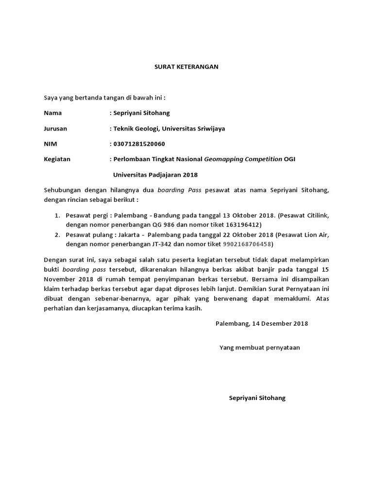 Contoh Surat Keterangan Kehilangan Boarding Pass – Demikian surat keterangan ini kami buat agar bisa digunakan sebagaimana mestinya atas pemakluman dan kebijaksanaannya kami ucapkan banyak terimakasih. Contoh surat kehilangan boarding pass. By servyoutube last updated. Zwitsal surat keterangan kehilangan dari kantor polisi jakarta utara surat permohonan penerbitan khs dan pernyataan fisip unsri. Inilah pembahasan lengkap terkait contoh surat pernyataan kehilangan boarding pass. Much more than documents..