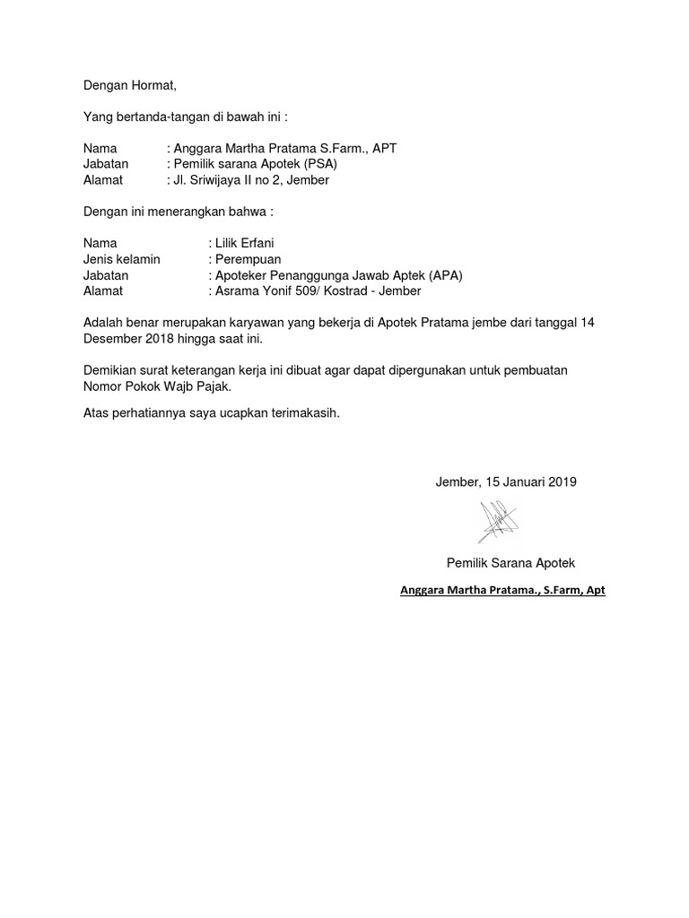 Surat pengalaman kerja ini berguna sebagai bukti bahwa seseorang itu sudah memiliki pengalaman kerja di bidang tertentu sesuai dengan yang tertera pada surat pengalaman kerja. They are so many great picture list that may become your creativity and informational reason for Contoh Surat Keterangan Kerja Farmasi design ideas on your own collections. Permohonan surat izin praktik apoteker sipa kesatu kedua ketiga.