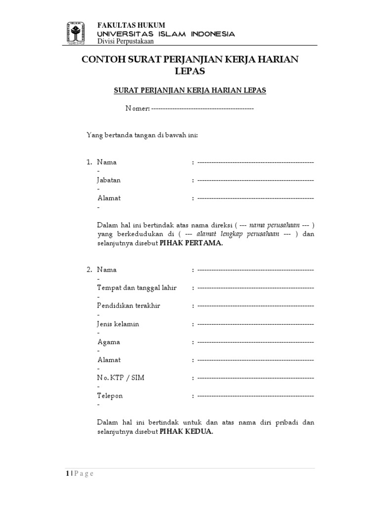 Contoh Surat Perjanjian Kerja Harian Lepas Fh Uii Pdf