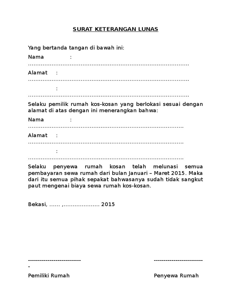 Mencegah kecurangan adanya penagihan jumlah yang tidak tepat atau mengelak dari pembayaran. Contoh Surat Pernyataan Lunas Pembayaran Namun jika anda lebih memilih cara tersebut maka dengan sekali bayar saja hutang anda akan langsung lunas. Anda dapat mendownload contoh file dokumen surat pernyataan ini baik dalam bentuk format doc word maupun pdf.