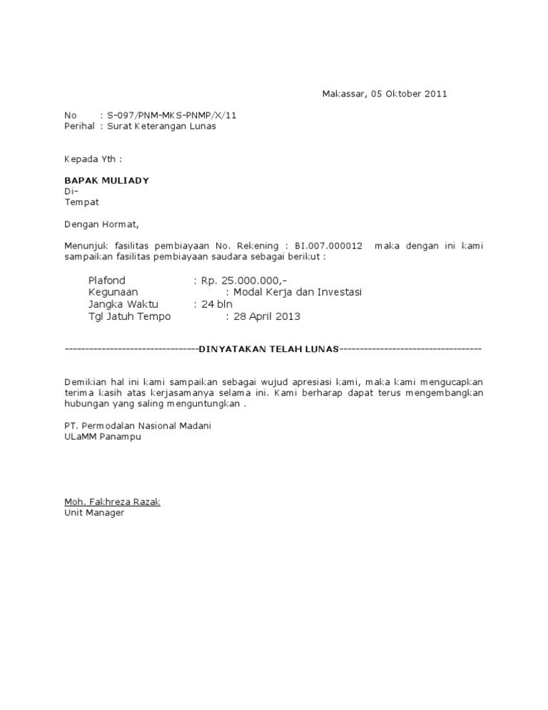Home Contoh Surat Surat Keterangan Lunas Kartu Kredit Bank. Contoh surat pernyataan membayar hutang secara lunas. 21000000- Dua puluh satu juta rupiah.