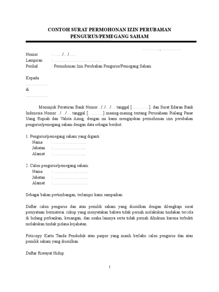 Surat Permohonan Ijin Perubahan Pengurus Pemegang Saham Pdf