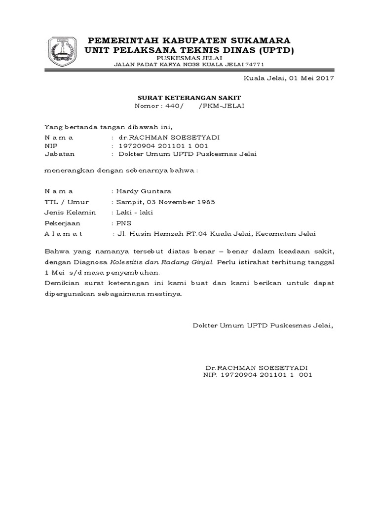 Contoh Surat Keterangan Sakit Dari Puskesmas. Contoh Surat Permohonan Cuti Sakit Yang Baik Dan Benar. Surat izin sakit adalah surat yang berisi keterangan bahwa seseorang tidak bisa mengikuti kegiatan belajar ataupun berhalangan hadir karena sakit.