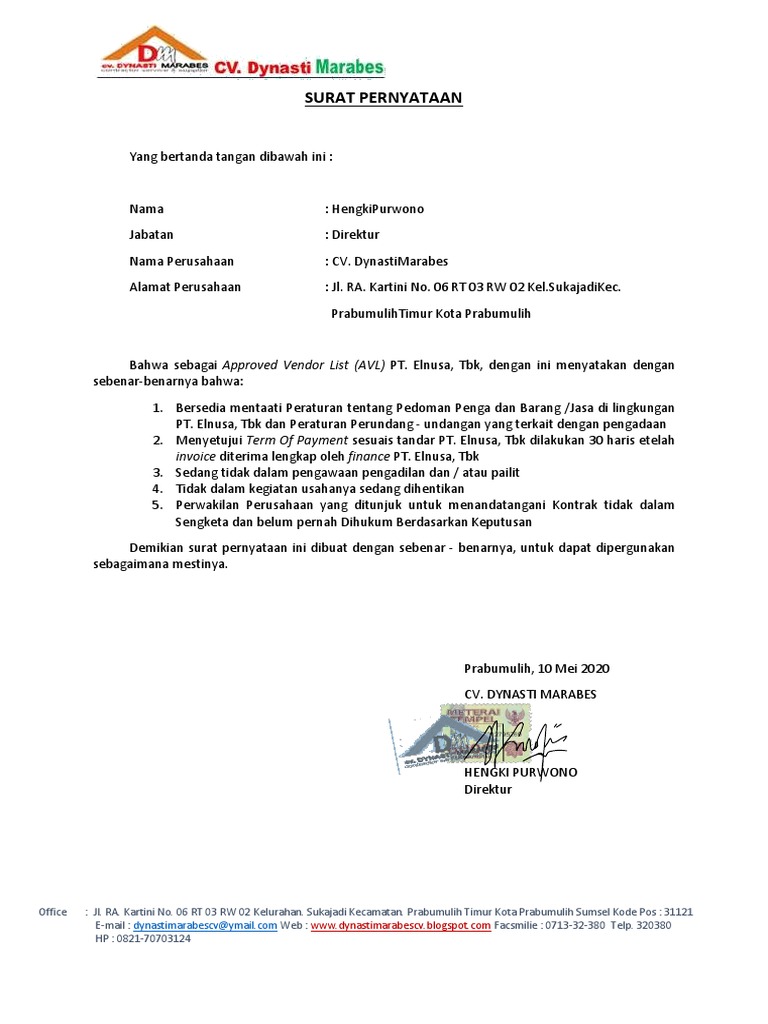 Surat Pernyataan Elnusa Approved Vendor List Pdf