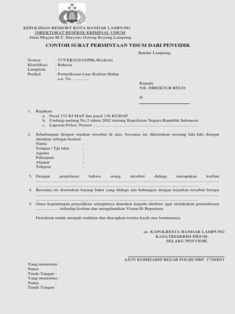 Dari pasal-pasal di atas tampak bahwa yang dimaksud dengan keterangan ahli maupun surat dalam KUHAP adalah sepad an dengan yang dimaksud dengan Visum et R epertum dalam Stb no. Admin blog Kumpulan Surat Penting juga mengumpulkan gambar-gambar lainnya terkait contoh surat permintaan visum dari kepolisian dibawah ini. Seperti yang telah kita ketahui bersama bahwa profesi seorang dokter.