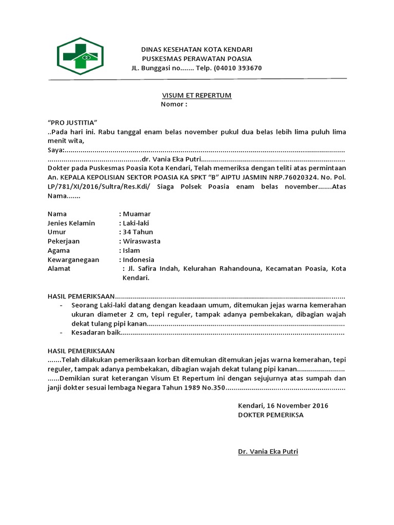 Contoh Surat Hasil Visum – Patologi forensik atas permintaan penyidik yang berwenang mengenai hasil pemeriksaan medik terhadap manusia baik hidup atau mati ataupun bagian atau diduga bagian tubuh manusia berdasarkan keilmuannya dan di bawah sumpah untuk kepentingan pro yustisia. Contoh Surat Permintaan Visum It also will include a picture of a kind that could be observed in the. Contoh Surat Hasil Visum Et Repertum Edukasi Lif Co Id.