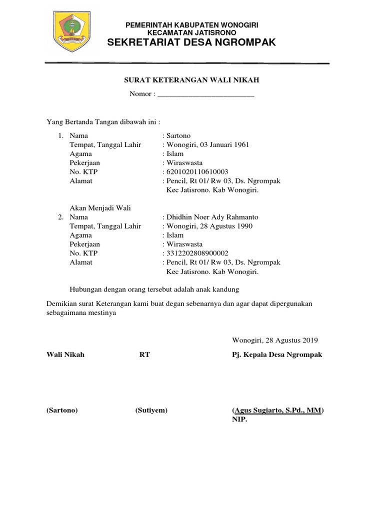 Contoh Surat Pernyataan Nikah Siri Sebuah pernikahan yang dinyatakan resmi di Indonesia haruslah diakui secara sah oleh agama maupun negara. Form Surat Keterangan Wali Nikah. Sebelumnya pihak wali nikah pengganti dapat membuat surat pengantar terlebih dahulu sebelum dibuatkan surat pernyataan wali nikah secara resmi.