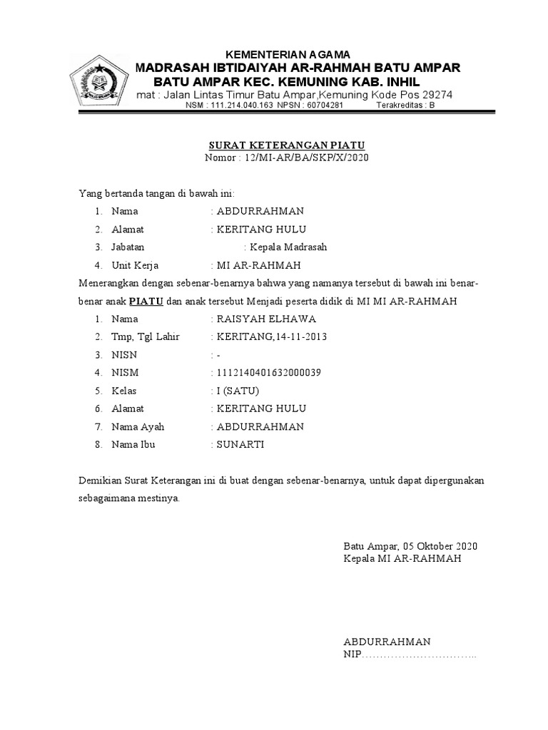 Contoh Surat Keterangan Yatim Piatu Yatim Piatu Dari Kepala Madrasah Operator Adlaniyah
