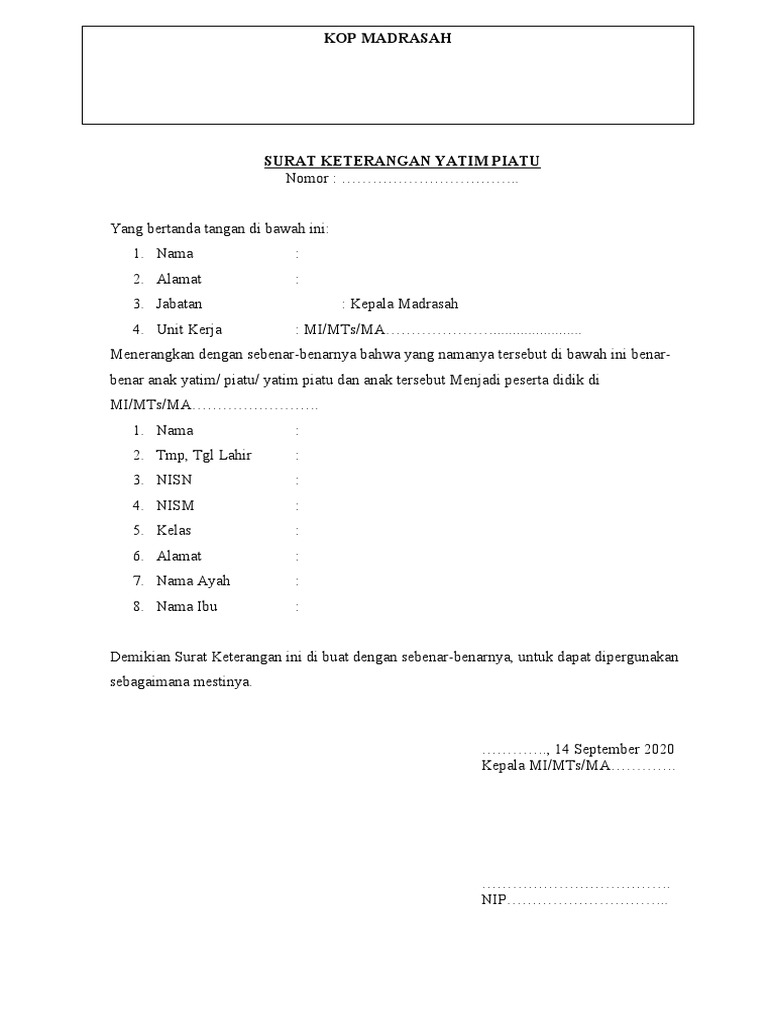 In Administrasi In emis surat. Adapun file Contoh Contoh Format Surat Keterangan Yatimpiatuyatim Piatu Dari Kepala Madrasah bisa di download di tautan ini. Ketua Karang Taruna Palito Mudo Sekretaris.