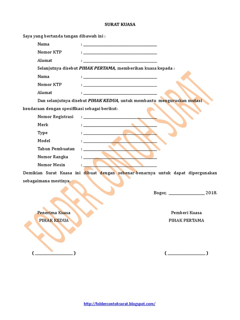 Yang bertanda tangan dibawah ini. Selanjutnya disebut PIHAK PERTAMA memberikan kuasa kepada. Contoh Surat Kuasa Mutasi Kendaraan Bermotor Contoh surat kuasa untuk balik nama kendaraan bermotor have an image associated with the other.