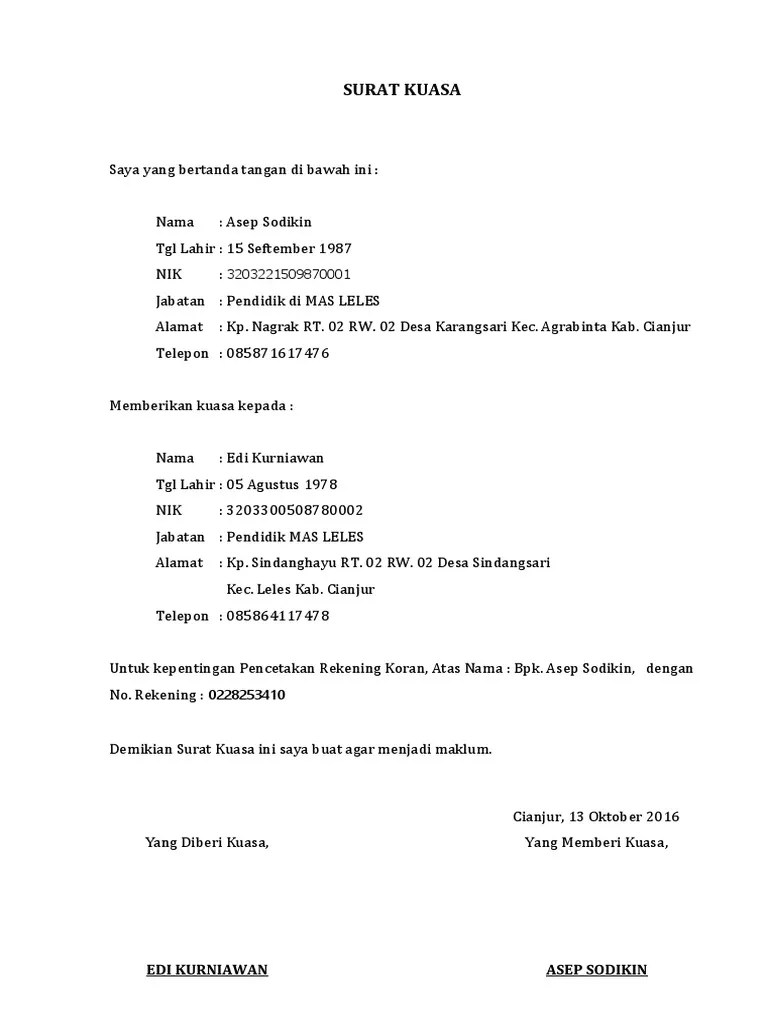 Contoh surat kuasa pengalihan no rekening pertama surat kuasa adalah surat yang berisi pelimpahan wewenang dari seseorang atau pejabat tertentu kepada seseorang atau pejabat lain. Nah apabila anda mendaftarkan ktp dan buku rekening yang namanya berbeda maka anda wajib melengkapi surat kuasa. Padahal anda harus membuka rekening baru di bank.