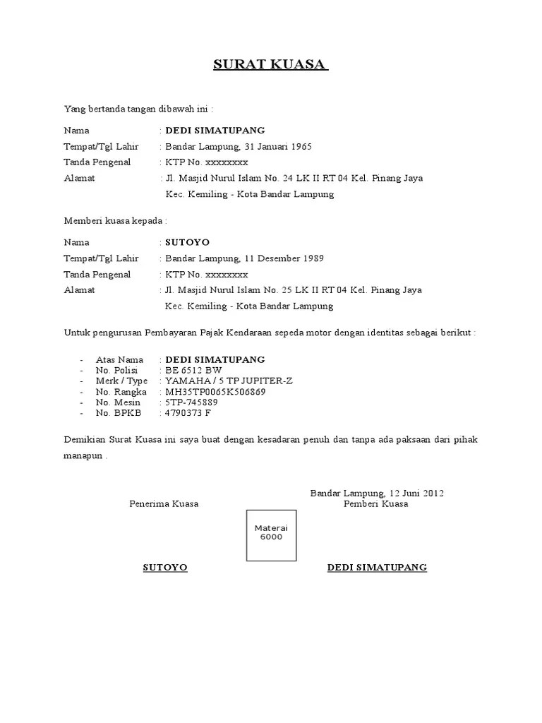 Kudus 12 november 2019 pemberi kuasa penerima kuasa materai 6000 kurniawan. Contoh surat kuasa pengurusan pembayaran pajak sepeda motor digunakan sebagai salah satu persyaratan dalam proses pembayaran pajak kendaraan bermotor jika pembayaran tersebut diwakilkan. Lihat contoh contoh diatas dalam format microsoft word dibawah ini.