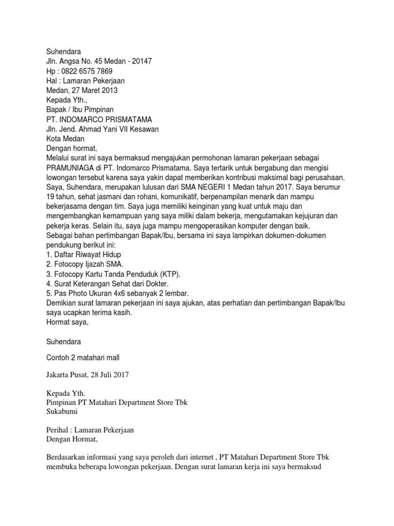 Kali ini kita akan membahas mengenai contoh surat lamaran kerja di Mall Matahari yang benar dan tepat. 15 contoh surat lamaran kerja spg spb atau pramuniaga di counter hp swalayan mall dan toko surat lamaran kerja mei 09 2020 07 08 contoh. Ketika melamar pekerjaan ada dua berkas yang tak boleh luput dari perhatian para job seeker yaitu CV atau riwayat hidup dan juga surat lamaran atau application letterDi antara dua berkas tersebut surat lamaran kerja atau application letter sering kali diabaikan oleh para job seeker dengan tidak menyertakannya bersamaan dengan CV.