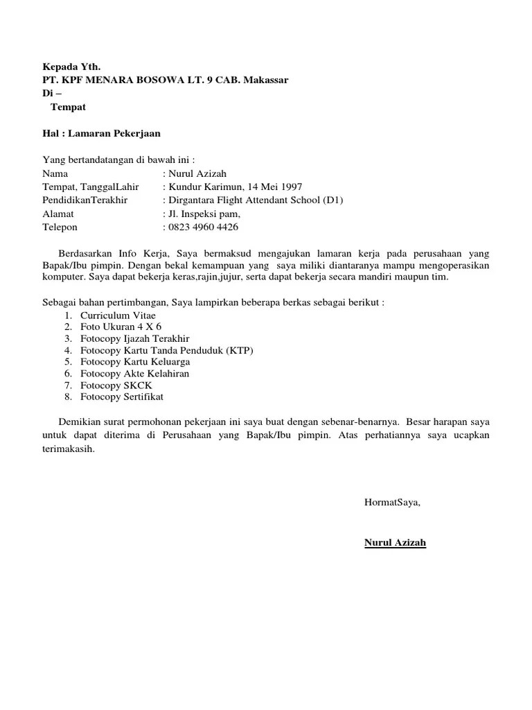 Contoh surat lamaran pt bosowa. Surat lamaran kerja adalah surat yang digunakan untuk melakukan permohonan mendapatkan pekerjaan sesuai pengalaman pada perusahaan tertentu. Surat lamaran kerja lamp. Dengan hormat saya yang bertanda tangan dibawah ini.