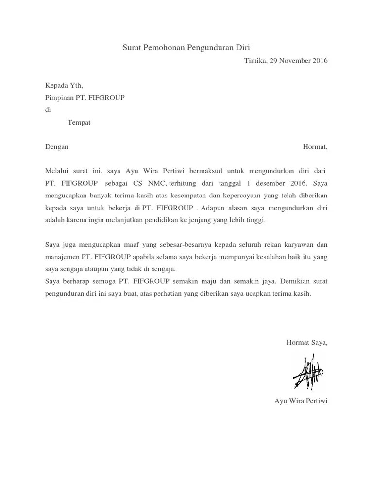 Melalui surat ini saya hendak menyampaikan untuk mengajukan permohonan pengunduran diri pada tanggal 10 maret 2018 dengan alasan ingin melanjutkan pendidikan s3. Contoh surat pengunduran diri dengan mencantumkan. Selain memikirkan alasan yang tepat tentunya pengunduran diri secara baik baik juga perlu dilakukan dengan melampirkan surat pengunduran diri.