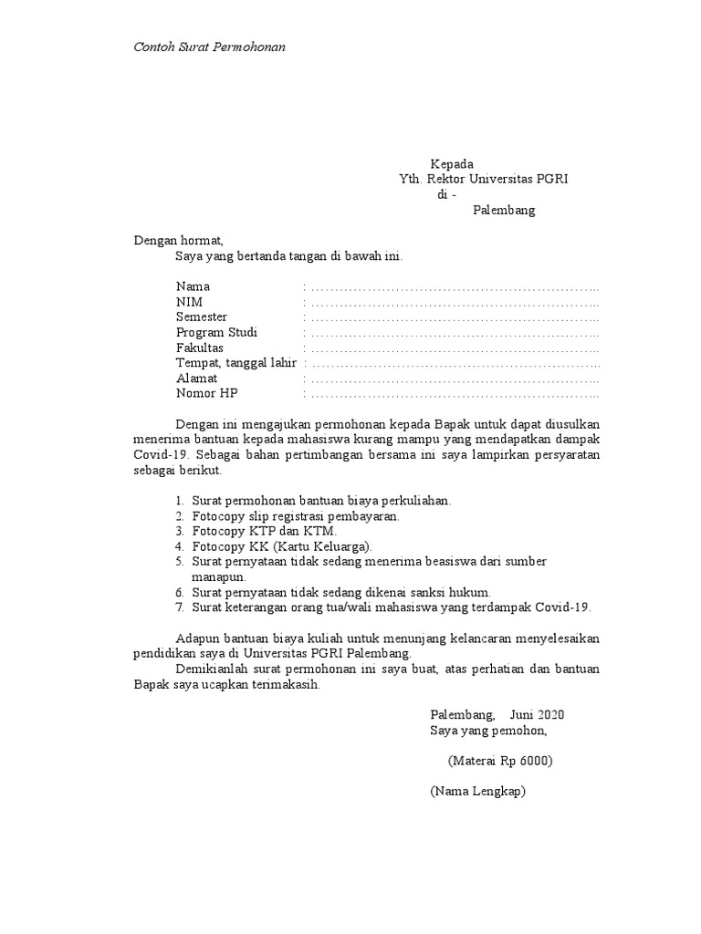 Keadaan yang menyebabkan harus dilakukan pergeseran antar jenis belanja Keadaan yang menyebabkan sisa lebih perhitungan tahun sebelumnya dan harus digunakan dalam tahun berjalan Terjadi penambahan danatau. Demikian surat permohonan bantuan beasiswa ini saya buat dengan sebenar-benarnya. Contoh Surat Lamaran Kerja yang Baik dan Benar Bikin HRD Kepincut.