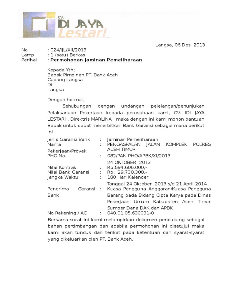 Surat Permohonan Jaminan Pemeliharaan Cv Idi Jaya Lestari Pdf