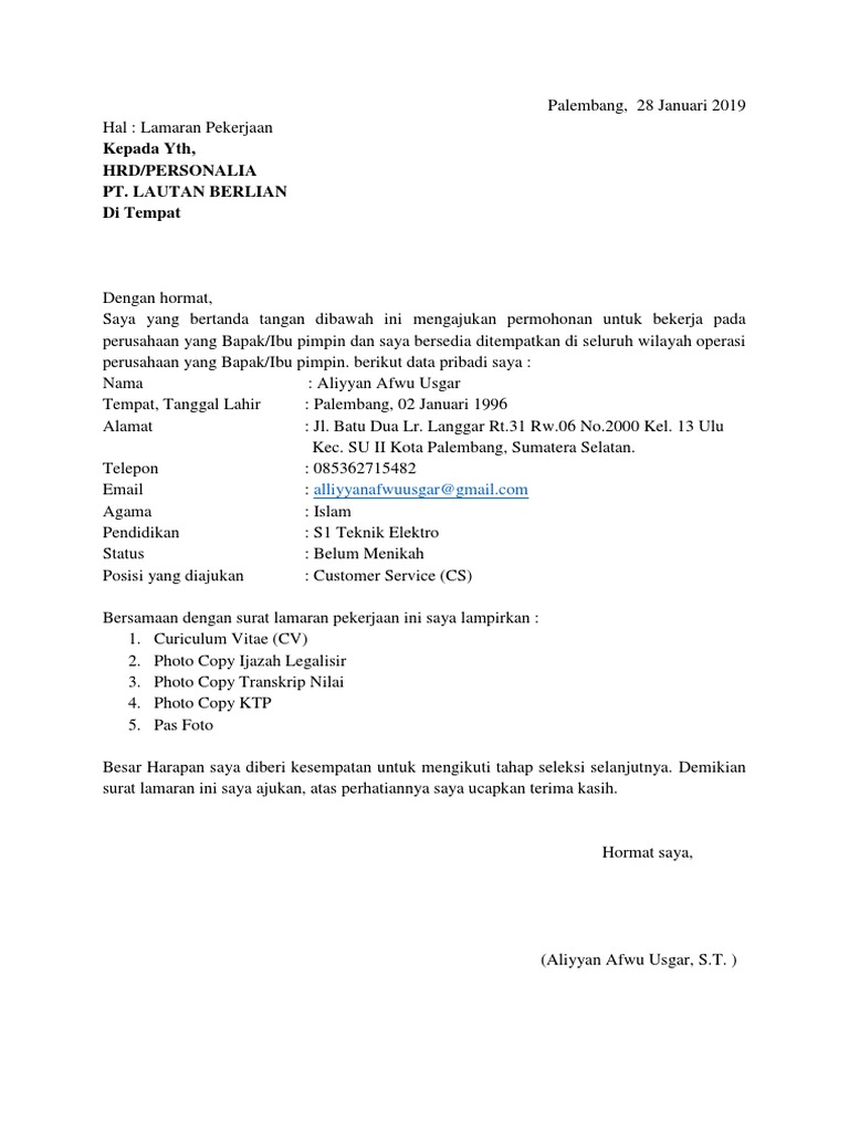 Contoh Surat Lamaran Kerja Di Pt Sebagai Karyawan Terlengkap