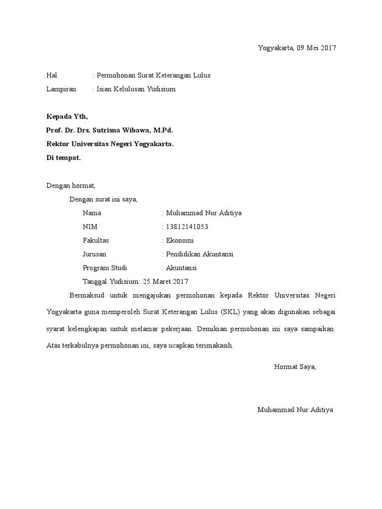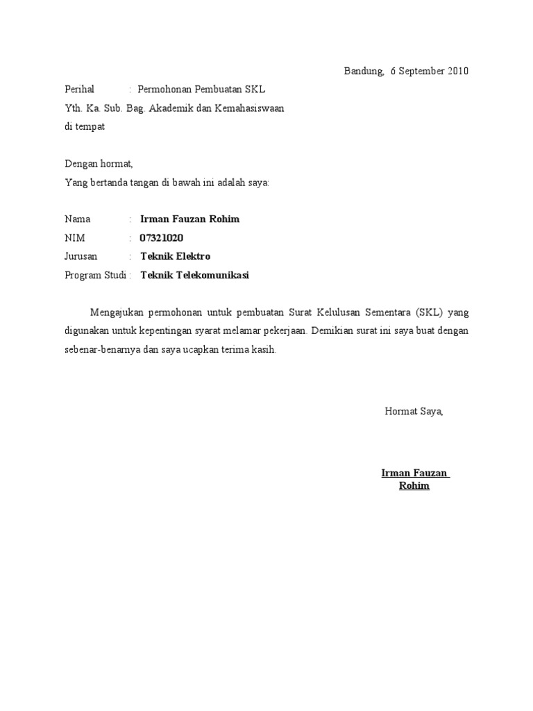 Untuk mendapatkan surat keterangan lulus sementara SKL dan Transkrip nilai Fakultas Matematika dan Ilmu Pengetahuan Alam Universitas Indonesia dikarenakan mahasiswa y an g bersangkutan sudah menyelesai kan kewajibannya di Program Studi diantaranya. Demikian surat ini saya buat dengan sebenar-benarnya dan saya ucapkan terima kasih. Surat Permohonan Skl Contoh surat permohonan dalam kehidupan sehari hari sering kali kita dihadapkan dengan suatu situasi yang tidak dapat dikerjakan dengan sendiri dan harus memerlukan bantuan pertolongan dari orang lainagar permohonan tersebut dikabulkan maka.