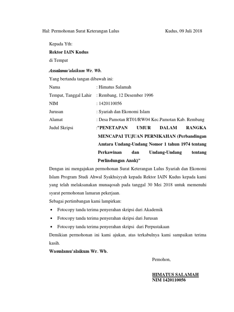Contoh surat keterangan lulus kuliah picture placed ang uploaded by admin that kept in our. 39 Tahun Agama. Mengajukan permohonan untuk pembuatan Surat Kelulusan Sementara SKL yang digunakan untuk kepentingan syarat melamar pekerjaan.