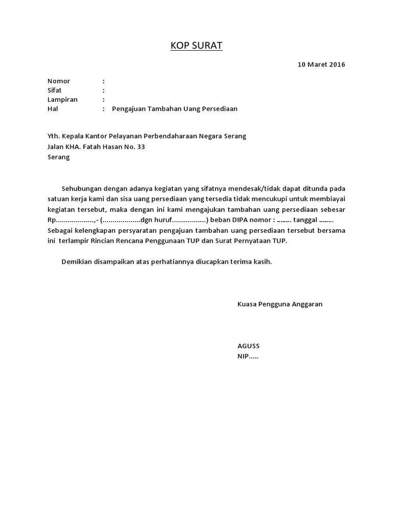 1 Surat Permohonan dari KPA yang memuat alasan dispensasl perpanjangan pertanggungjawaban TUP sesuai contoh format lampiran IV. Surat Pernyataan akan Menyelesaikan Rekonsiliasi KLIK UNTUK DOWNLOAD. Format surat permohonan pengembalian dana atas pemotongan pph pasal 23.