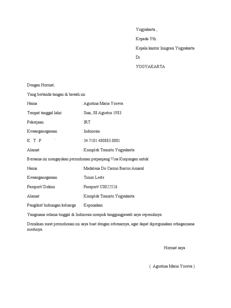 Surat perpanjangan visa kunjungan surat pernyataan dan jaminan sponsor. Jika orang lain yang memberikan dukungan untuk permohonan anda surat keterangan dari orang tersebut yang menyatakan tujuan kunjungan anda lama tinggal hubungan anda dengan mereka dan jenis dukungan yang diberikan contoh keuangan akomodasi dll.