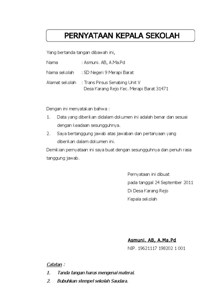Ada banyak contoh surat pernyataan yang biasanya banyak digunakan mulai dari surat pernyataan belum menikah surat pernyataan diri surat pernyataan menyesal sampai dengan surat pernyataan kesanggupan. Format pernyataan kepala sekolah ini baik jenjang paud tk ra sd smp sma smk dan man sama isinya dan kegunaanya. Dalam contoh surat pernyataan akreditasi sapto gawe cv telah memilihkan tema atau template yang terbaik untuk dijadikan inspirasi ide ataupun acuan dalam penulisan surat anda.