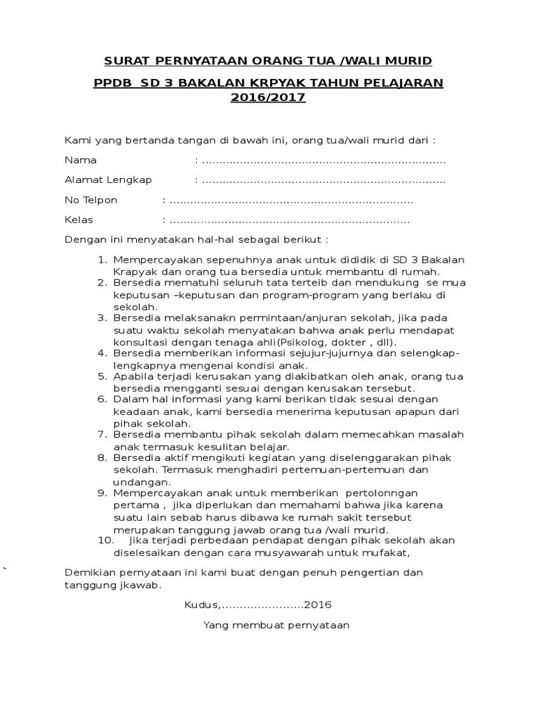 Contoh Surat Pernyataan Orang Tua Siswa Baru Sd – Surat ini biasa dipergunakan pada jenjang pendidikan sd smp sma. 4 contoh surat pernyataan orang tua wali murid berikut adalah contoh surat pernyataan orang tua murid atau wali yang bisa dipergunakan untuk siswa siswi sd smp sma atau mahasiswa yg sedang kuliah. Contoh surat pernyataan orang tua siswa baru ketika seorang anak memasuki sekolah baru ataupun sebagai siswa baru maka tentu ada banyak peraturan yang harus dipenuhi. Contoh surat permohonan beasiswa ada banyak usaha pemerintah untuk memajukan pendidikan di indonesia. Download surat pernyataan orang tua download disini kegiatan pembelajaran tahun pelajaran 2019 2020 akan berakhir. Contoh surat permohonan mutasi siswa dari orang tua..