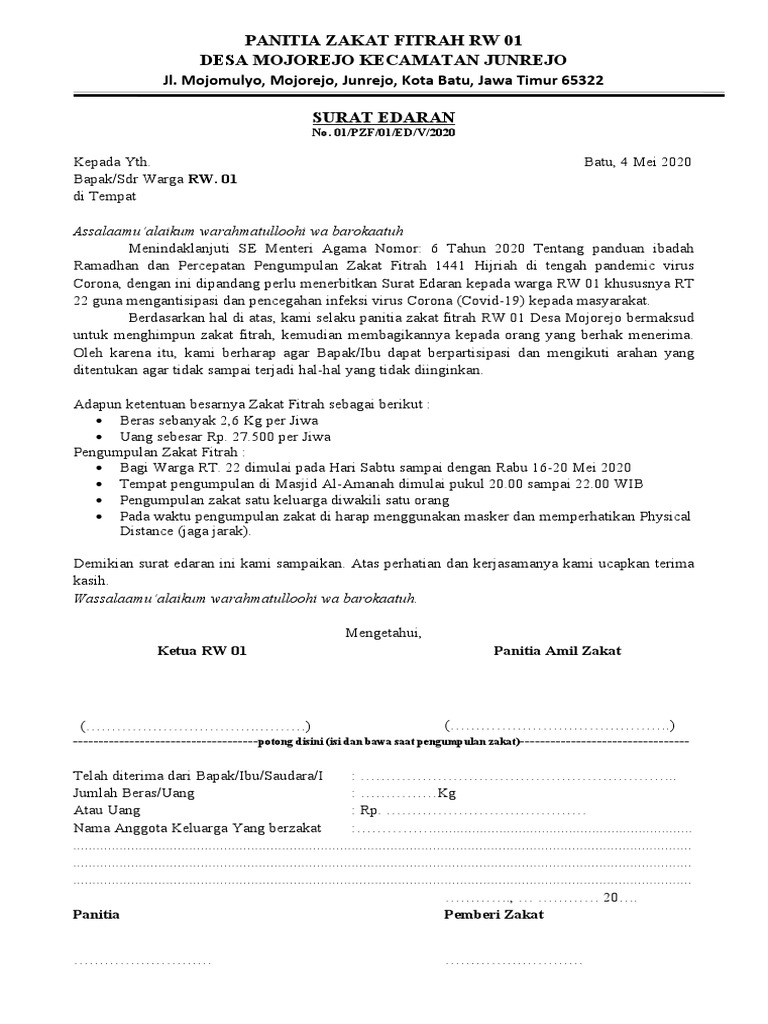Contoh surat zakat fitrah masjid. Maka Kami Pengurus Tamir Masjid Baiturrohman Jajangan Dengan Surat ini Memutuskan bahwa Susunan Panitia Zakat Fitrah Tahun 1431 H. Surat Permohonan Pemberhentian Potongan Gaji. Laporan Pelaksanaan Zakat 1433 H Dusun I Dan Ii.