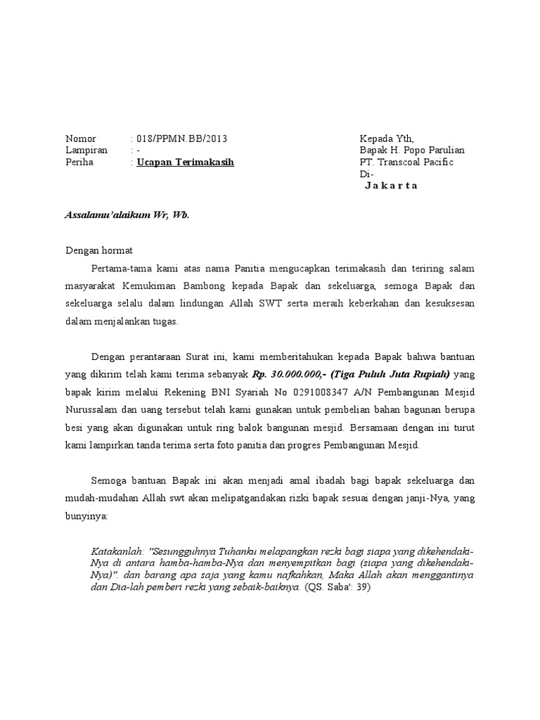 Inilah pembahasan selengkapnya mengenai contoh surat ucapan terima kasih atas bantuan dana pembangunan masjid. 86 7 86 menganggap dokumen ini bermanfaat 7 suara 45K tayangan 2 halaman. Ucapan Terima Kasih Alhamdulillah puji dan syukur atas rahmat Allah Subhana Wa Taala hingga kita selalu diberi kekuatan dan istiqamah dalam islam.