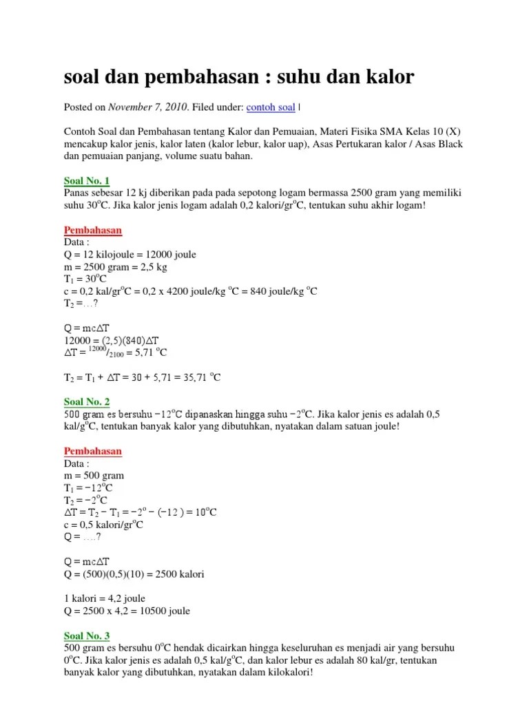 Soal Dan Jawaban Fisika Materi Suhu Dan Kalor – Kinematika gerak lurus 3. Besaran satuan pengukuran dan vektor 2. Soal jawaban suhu dan kalor untuk smp 1. Dengan mengabaikan pertukaran kalor dengan lingkungan hitung suhu akhir campuran jika kalor jenis aluminium 900 j kgk dan kalor jenis air 4 200 j kgk. Alat alat optik klik salah satu materi pokok di atas yang ingin anda. 10 contoh soal dan pembahasan suhu dan kalor baiklah pada pertemuan ini kita akan mencoba melatih diri kita dengan contoh soal suhu dan kalor..