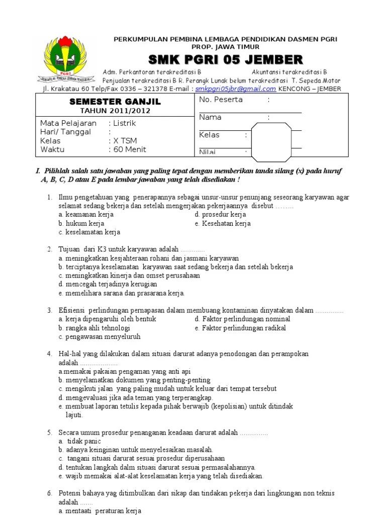 Soal Dan Jawaban Prosedur K3 – Soal pilihan berganda standar kompetensi. Salah satu tujuan awal dibentuknya standard keselamatan dan kesehatan di tempat kerja adalah. Pada kesempatan kali ini kakak ingin membagikan kumpulan soal soal pilihan ganda bahasa indonesia tentang teks prosedur kelas 7 11 12 dan kunci jawabannya. Salah satu tujuan awal dibentuknya standard keselamatan dan kesehatan di tempat kerja adalah. Melakukan kepelatihan k3 pada setiap tenaga kerja. K3 merupakan perkembangan dari..