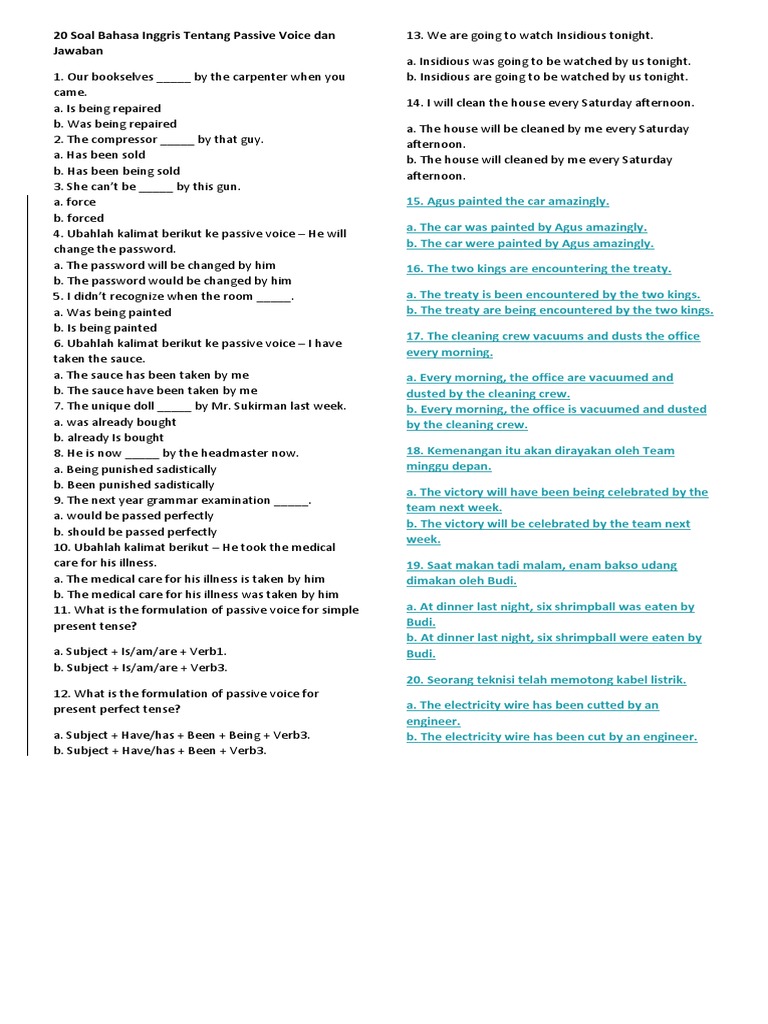 Soal Dan Pembahasan Bahasa Inggris Passive Voice – Pada kali ini kami akan membagikan latihan soal salah satu kompetensi dasar dalam mata pelajaran bahasa inggris smp sma yaitu tentang passive voice. Pola passive voice dalam soal tes toefl pasive voice dalam soal bagian structure and written expression bisa saja dapat anda temukan ketika mengikuti tes toefl untuk menjawab soal pola ini anda harus memahami pola polanya dengan baik passive voice atau kalimat pasif adalah kalimat yang objek dari kalimat aktifnya menjadi subjek pada kalimat pasif. Soal passive voice pilihan ganda jawaban pembahasan by teguh rpg posted on november 3 2018. Passive voice is a type of sentence or clause in which the subject receives the action of the verb passive voice adalah jenis kalimat atau klausa di mana subjek menerima tindakan dari kata kerja. Kalimat pasif diawali dengan pelaku yang merupakan sasaran objek dari kata kerja yang ada dalam kalimat tersebut. Untuk mengukur seberapa baik kemampuan anda menggunakan passive voice anda bisa melatih passive voice dengan soal soal tentang passive voice yang ada di bawah ini..