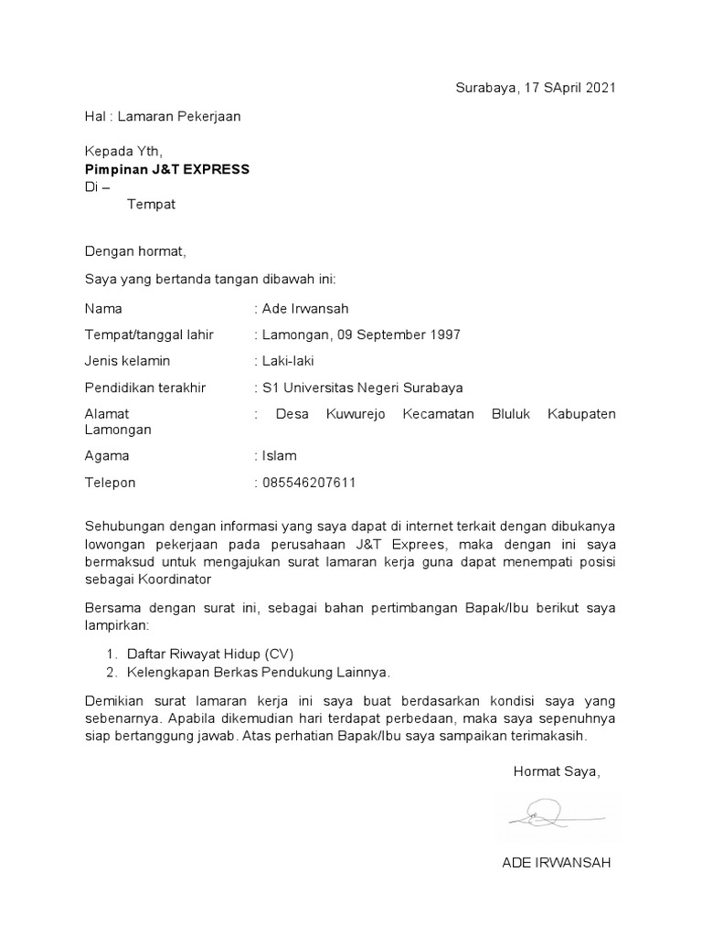 Contoh Surat Lamaran Kerja Kurir J T Pdf