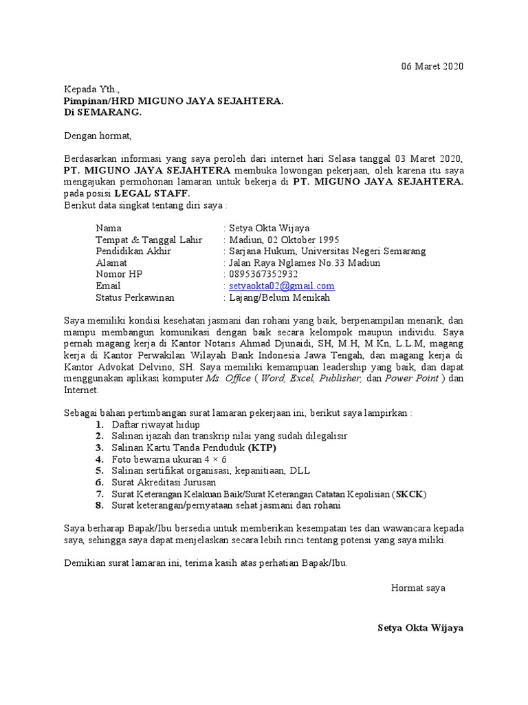 Minimum 1 years exp. Contoh Surat Lamaran Kerja Sebagai Staf Legal English Version PT. Pada kesempatan tersebut kami mengharap Saudari.