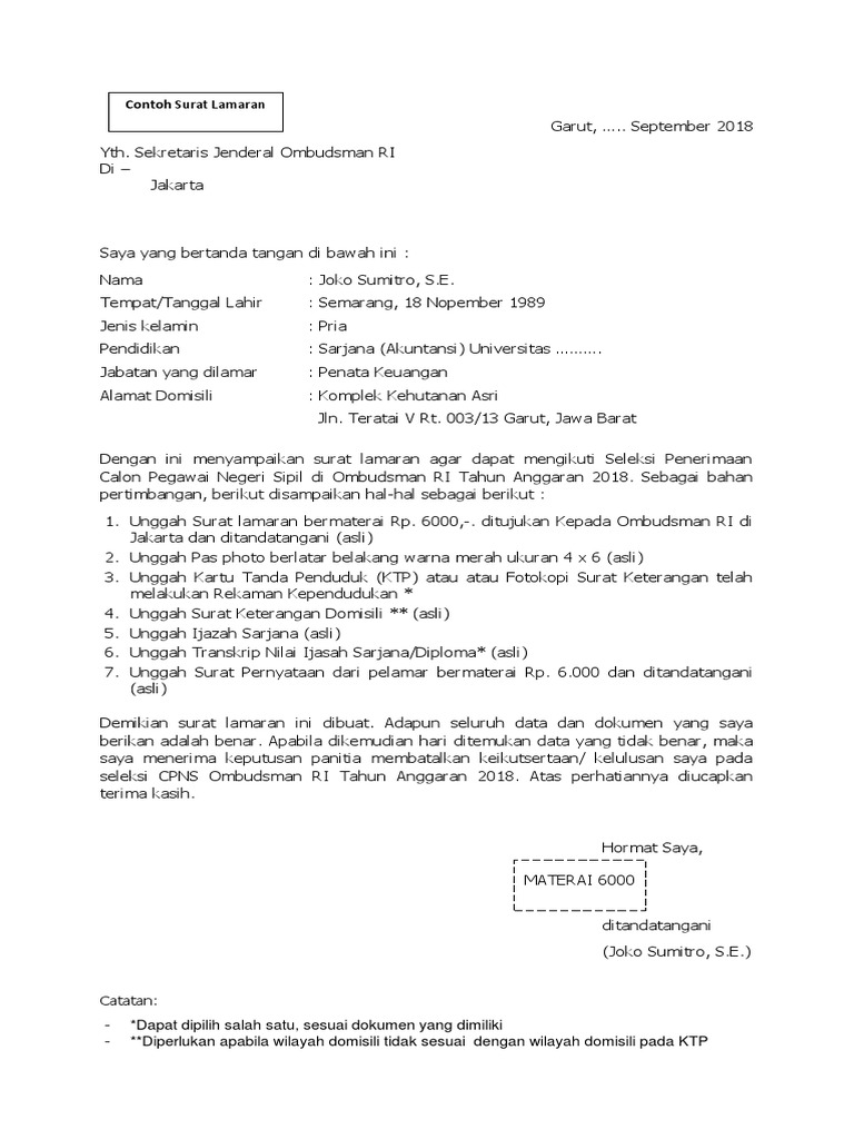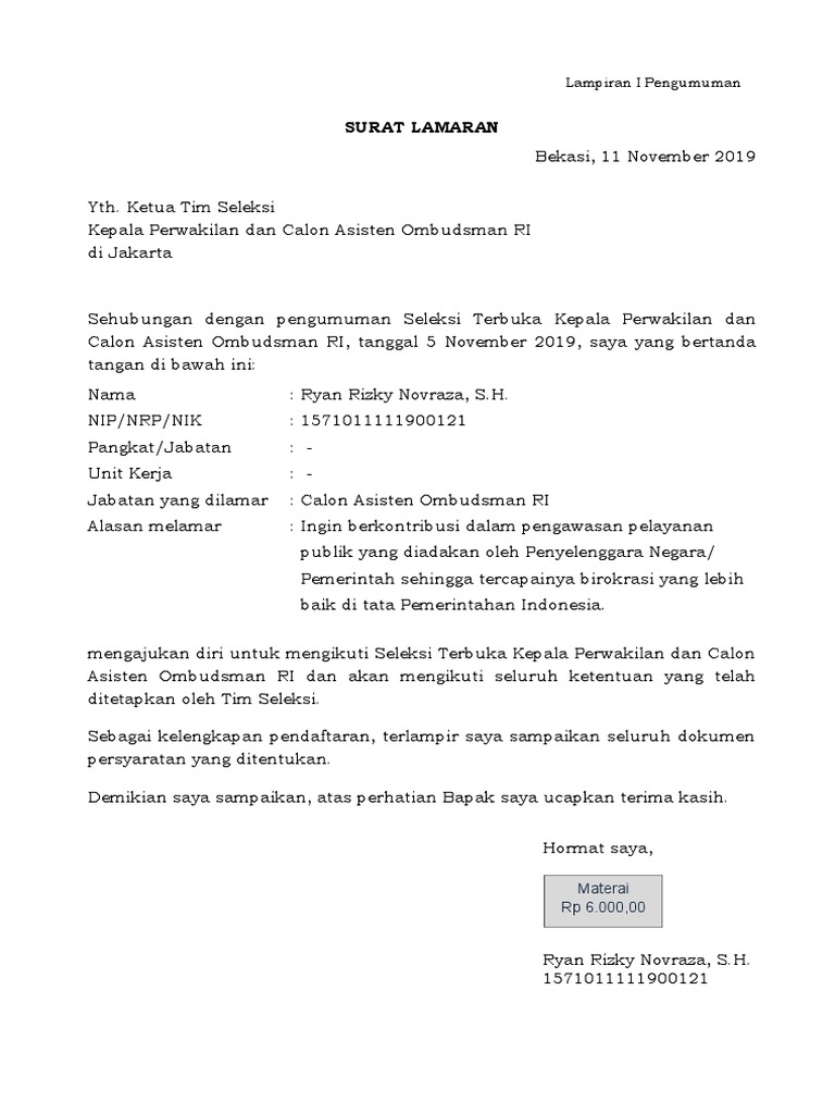 1 Surat Lamaran format file pdf maksimal 500 KB dapat diunduh pada. Formasi calon asisten Ombudsman RI yang dibuka Januari 2022. Unggah Surat lamaran bermaterai Rp.
